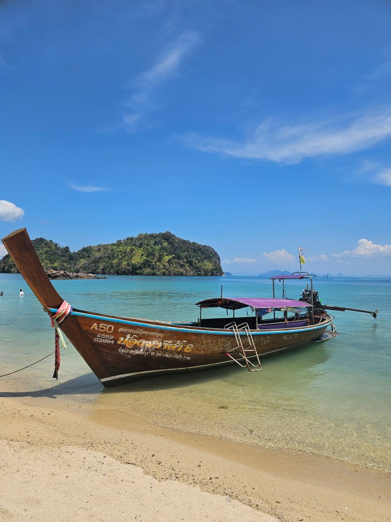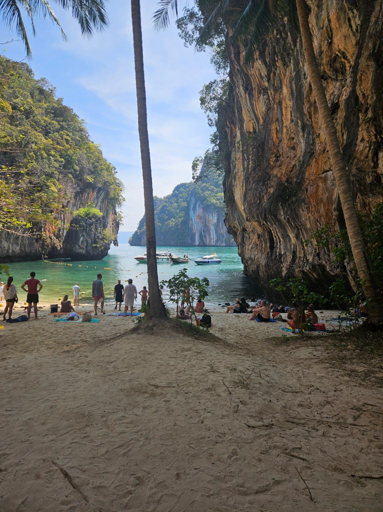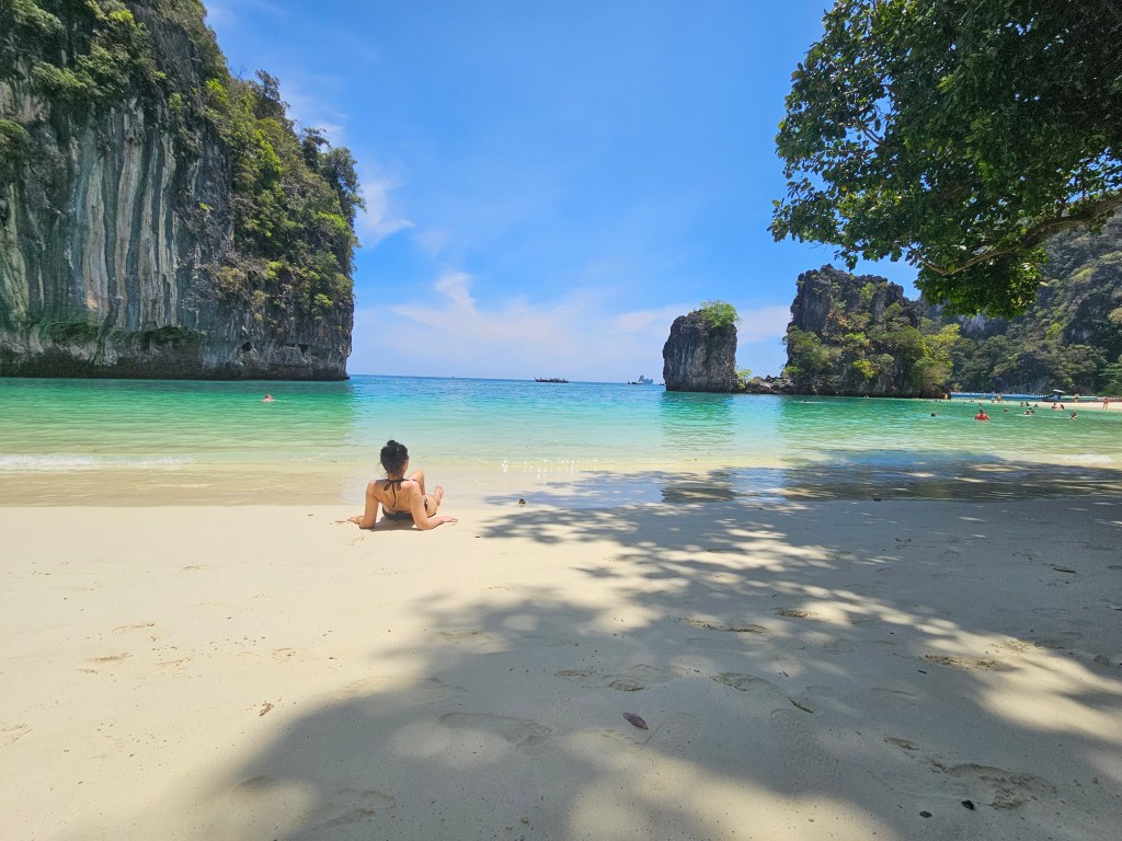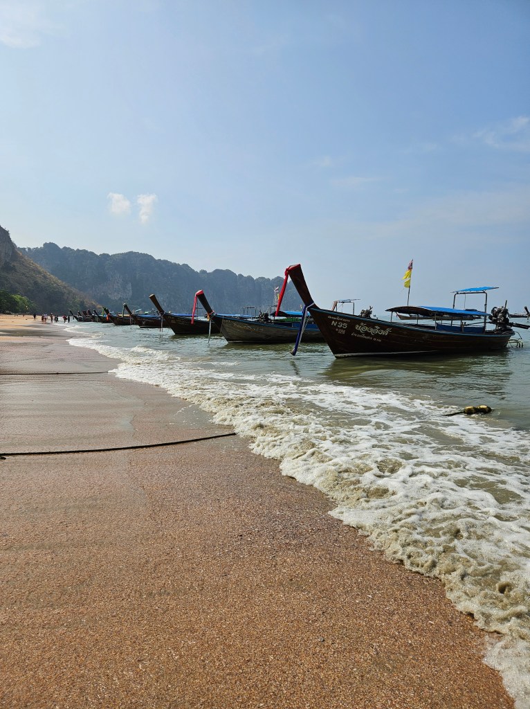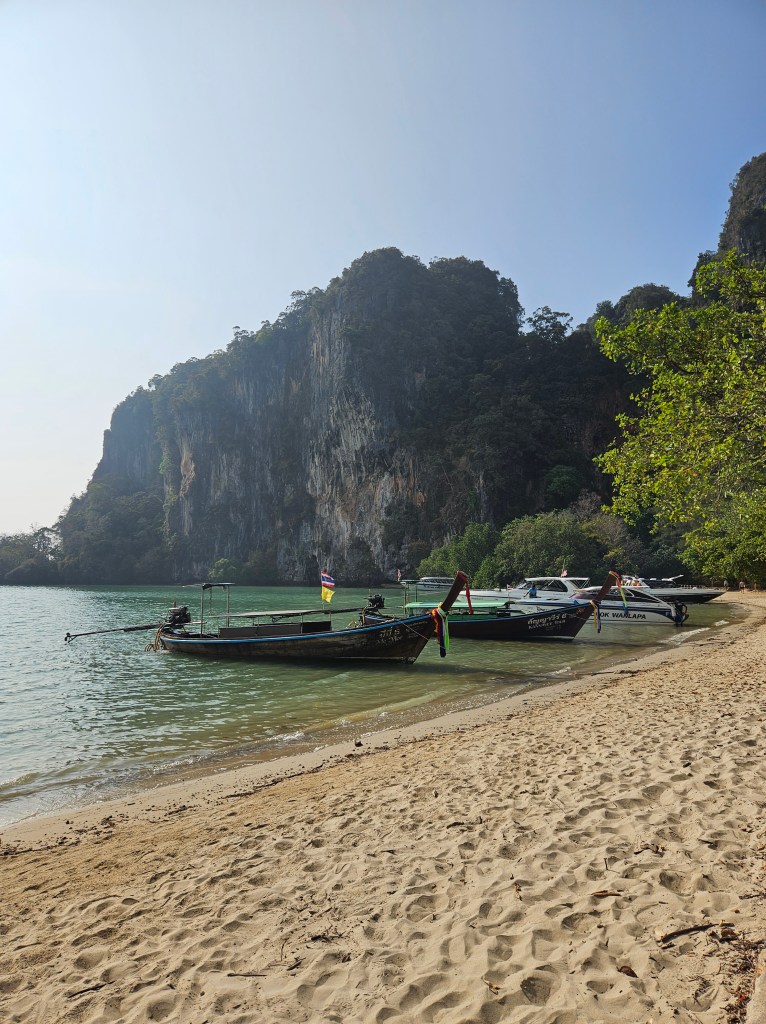 Krabi este un loc pe care îl poți folosi ca punct central pentru a pleca în diverse excursii, însă plaja din Ao Nang nu este spectaculoasă. Atmosfera este puțin haotică, iar eu nu am venit pentru haos – am venit să descopăr Thailanda autentică, natura și obiceiurile ei. Așa că, după această experiență, am decis să merg mai departe pentru câteva zile în Railay Beach, foarte aproape de Ao Nang. Am ajuns acolo în doar câteva minute cu barca, pregătită pentru o nouă aventură. 🚤🏝️
