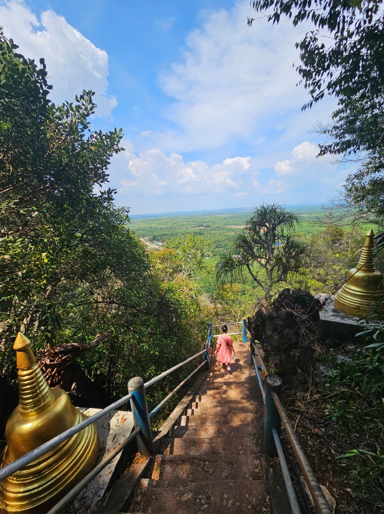 🏯 Tiger Cave Temple – 1260 de trepte ar fi trebuit să mă ducă la o panoramă incredibilă asupra Krabi însă, urcarea este extrem de obositoare și ghidul chiar ne-a avertizat să nu ne aventurăm dacă ni se pare prea greu deoarece, se pare că cineva a decedat în încercarea de a urca. Nici eu nu am reușit să ajung sus, am urcat doar jumătate însă, sunt convisă că priveliștea de sus merită tot. Încercă să vizitezi Tiger Cave de unul singur, nu într-un tur ghidat în care să fi presat de timp. Templul a fost fondat în 1975 de călugărul budist Ajahn Jumnien, care, conform legendei locale, a descoperit această peșteră în timpul unei meditații. Numele său provine de la forma unor stânci din peșteră, care seamănă cu urme de tigru, dar și de la miturile conform cărora tigrii locuiau aici în trecut.
